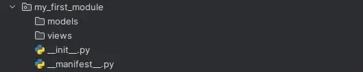 Ein Odoo-Modul besteht aus einer definierten Ordnerstruktur. Beginnen Sie, indem Sie einen Ordner für Ihr Modul erstellen. In diesem Beispiel nennen wir unser Modul my_first_module. Die Ordner „models“ und „views“ können vorerst leer bleiben, lediglich die __manifest__.py und __init__.py Dateien sind notwendig, wobei letztere auch keinen Code enthalten muss. Die Grundstruktur sieht folgendermaßen aus: